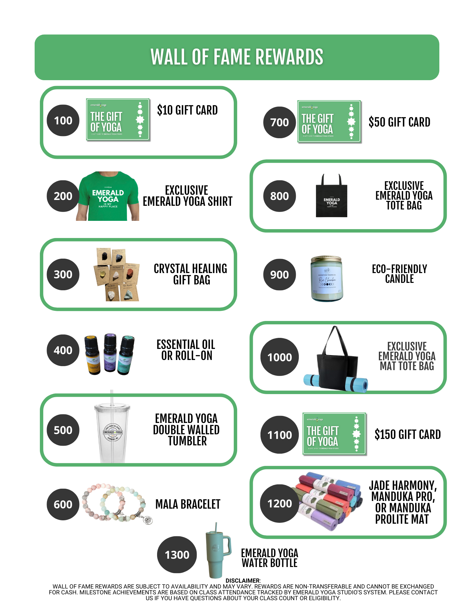 It’s simple! Every class you attend at Emerald Yoga Studio brings you closer to your first milestone at 100 classes. Our system automatically tracks your attendance, so all you have to do is show up, breathe, and practice. Once you hit a milestone, we’ll proudly add your name to the wall and celebrate your achievement with an exclusive reward.